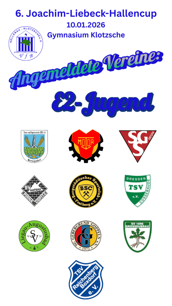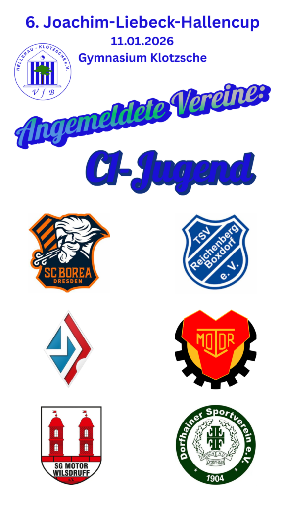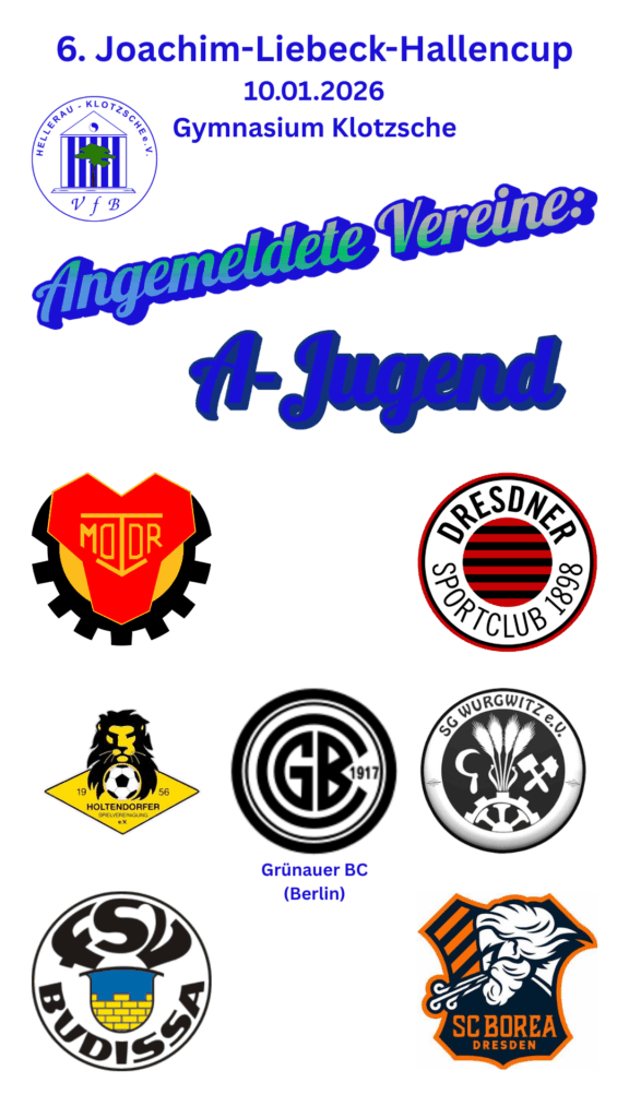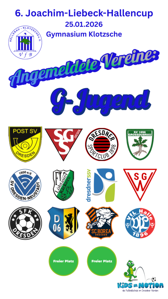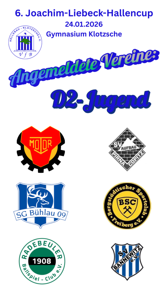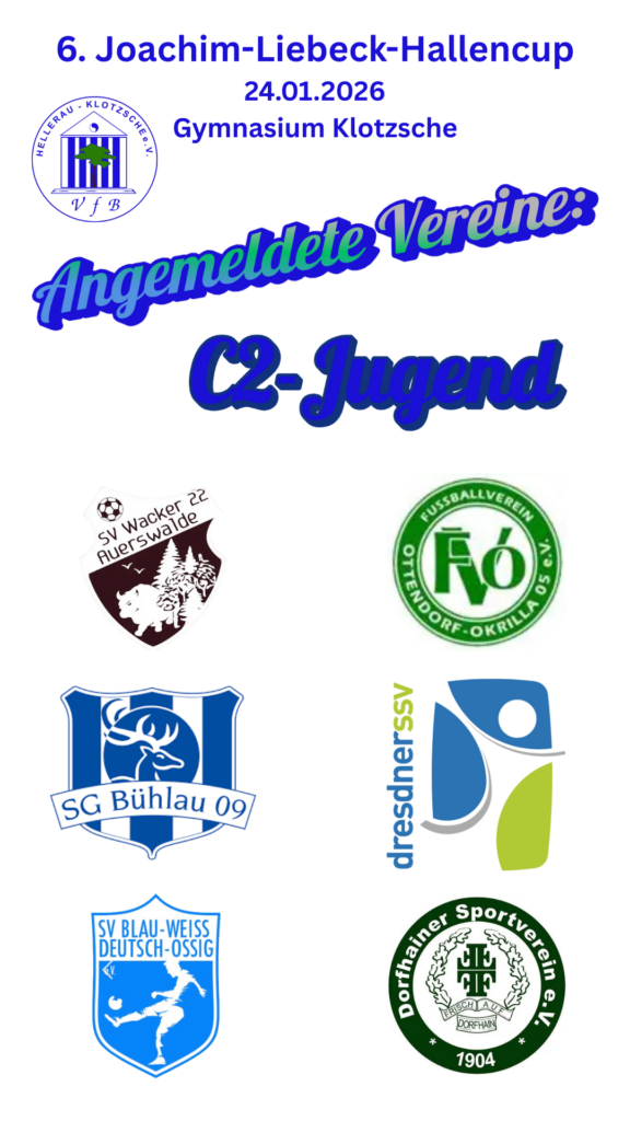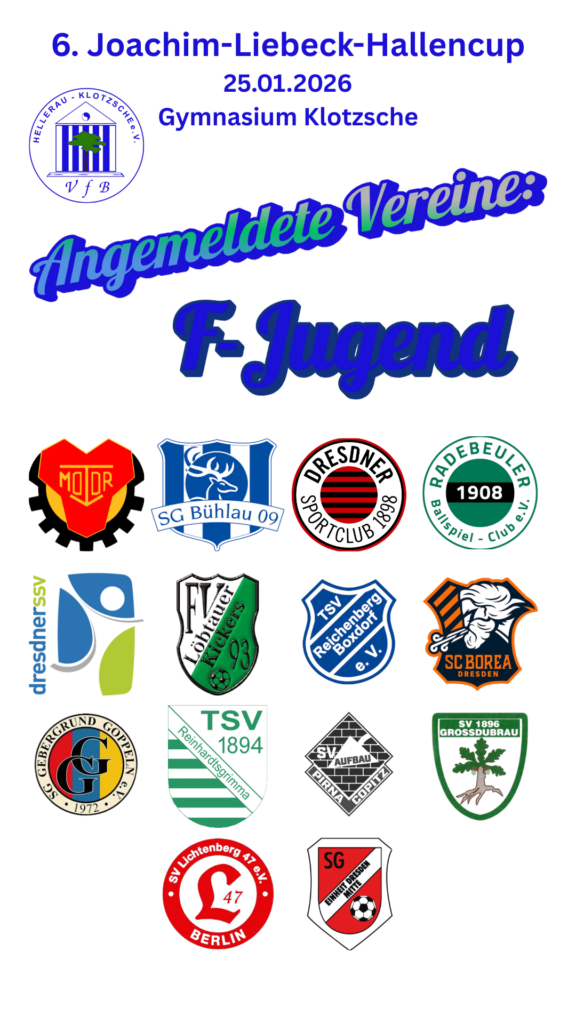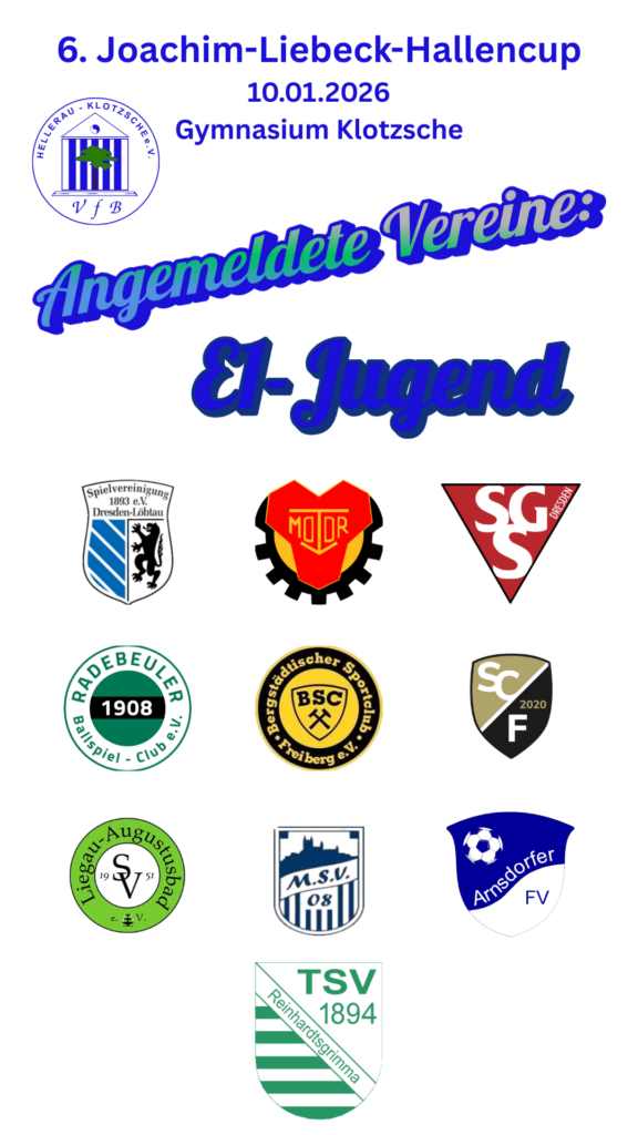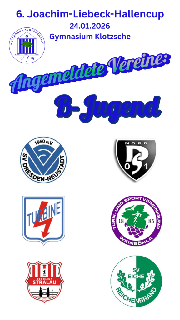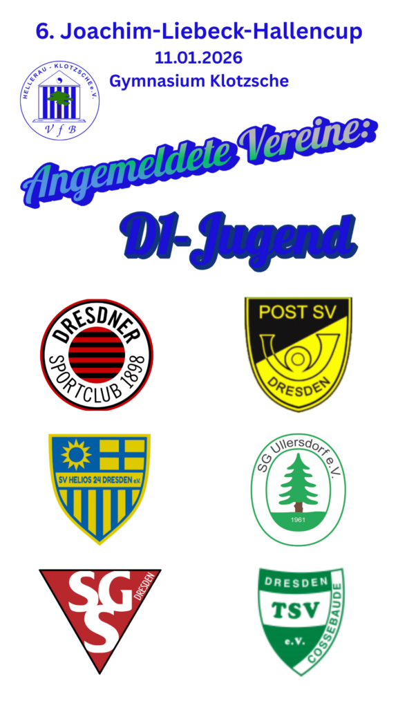 Fußball - Hallenturniere TURNIERE 2026: TURNIERINFORMATIONEN: ANMELDUNG PER MAIL: hallencup@vfb-hellerau-klotzsche.de TURNIERE HIER LIVE VERFOLGEN: 6. Joachim-Liebeck Hallencup@ALLE Read More 6. Joachim Liebeck Hallencup 2026 am 10.01. - 11.01. und 24.01. - 25.01.2026, Halle Gymnasium Dresden-Klotzsche Wie läuft das A-Jugend (U19) Turnier? Hier live verfolgen Wie läuft das B- Jugend (U17) Turnier? Hier live verfolgen... Wie läuft das C-Jugend (U15) Turnier? Hier live verfolgen... Wie läuft das C2- Jugend (U14) Turnier? Hier live verfolgen... Wie läuft das D1- Jugend (U13) Turnier? Hier live verfolgen Wie läuft das D2-Jugend (U12) Turnier? Hier live verfolgen Wie läuft das E1- Jugend (U11) Turnier? Hier live verfolgen... Wie läuft das E2-Jugend (U10) Turnier? Hier live verfolgen... Wie läuft das F-Jugend (U9) Turnier Hier live verfolgen... Wie läuft das G-Jugend (U7) Turnier? Hier live verfolgen... AKTUELLES SHORTLINKS UNSER VFB Fred Nitsche der Abt. Tischtennis ist Bezirksmeister (AK 60) November 21, 2025 Mehr lesen» A- und C-Jugend der Abt. Fußball stehen im Halbfinale des Stadtpokals November 20, 2025 Mehr lesen» Home Abteilungen News Downloads Sponsoren Über uns FAQ Gegründet 1993, 11 Abteilungen 1203 Mitglieder/-innen (31.12.2024) Karl-Liebknecht-Straße 53 01109 Dresden vorstand@vfb-hellerau-klotzsche.de + 49 (0) 351 - 8805565 Facebook Youtube Instagram Impressum Datenschutz Copyright 2022 © VfB Hellerau-Klotzsche