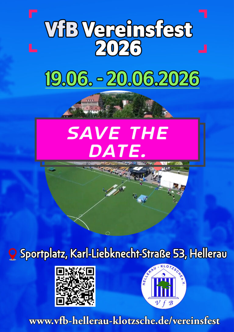 Vereinsfest Vereinsfest 2026: Vorplanung... 40% „Feste bilden eins der schönsten Bande der gesellschaftlichen Verbindung eines Vereins – es ist der Jubel des Vereins über das, was er fertig gebracht hat – und sie werden den Verein bis ans Ende seiner Tage tragen.“ Rudolf von Ihering AKTUELLES SHORTLINKS UNSER VFB Fußballteams der A- und C1- Junioren im Viertelfinale September 16, 2025 Mehr lesen» Adecco ist neuer Kooperationspartner des VfB August 28, 2025 Mehr lesen» Home Abteilungen News Downloads Sponsoren Über uns Gegründet 1993, 11 Abteilungen, 953 Mitglieder (2021) Karl-Liebknecht-Straße 53 01109 Dresden vorstand@vfb-hellerau-klotzsche.de + 49 (0) 351 - 8805565 Facebook Youtube Instagram Impressum Datenschutz Copyright 2022 © VfB Hellerau-Klotzsche